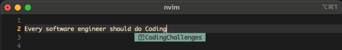 Viewed in neovim that looks like this: Step 4In this step your goal is to support Completion Requests. These are the requests that support code completion in your editor. In my solution I added support for the Completion Item “CodingChallenges” which looks like this in neovim: You’ve now built the framework needed to implement a full language server, though there is obviously much more that is possible, just take a read through the rest of the specification! Going FurtherTo take this project further you can work through the full specification adding support for all the notifications we didn’t look at. Alternately, or as well, you can build a tool to analyse the document(s) for a programming language of your choice. If you don’t know where to start there, perhaps check out the build your own JSON parser coding challenge and then use that parser to build a language server for JSON. P.S. If You Enjoy Coding Challenges Here Are Four Ways You Can Help Support It