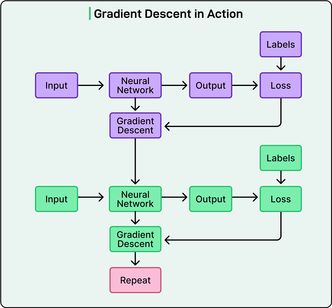 The Process: Gradient DescentOnce the loss function is decided, we need a process to actually improve the model. This is where gradient descent comes in. Gradient descent is the algorithm that figures out how to adjust the billions of parameters inside a neural network to reduce the loss. See the diagram below: Imagine you have a ball sitting somewhere on a hilly landscape. The ball’s position represents the model’s current parameter values. The height of the ground beneath the ball represents the loss function’s output. Valleys represent low loss (good performance), and peaks represent high loss (bad performance). The goal is to get the ball to the lowest valley possible. The process follows these steps: