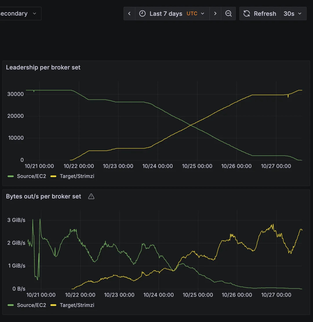 Phase 4: Gradually Shifting Data and TrafficWith both sets of brokers running inside the same cluster, Reddit used Cruise Control to incrementally move partition leadership and replicated data from EC2 brokers to the Kubernetes brokers. Partition leadership determines which broker is responsible for serving reads and writes for a given piece of data. Kafka stores copies of each partition on multiple brokers for redundancy. This is called the replication factor. Moving data meant reassigning both the leadership and the replicas to the new set of brokers, one partition at a time. Reddit monitored this process continuously as the partition leadership on EC2 declined steadily over roughly a week while leadership on Strimzi climbed in parallel. Network traffic followed the same pattern. At every point, Reddit could pause or reverse the process if something looked wrong. See the dashboard view below: