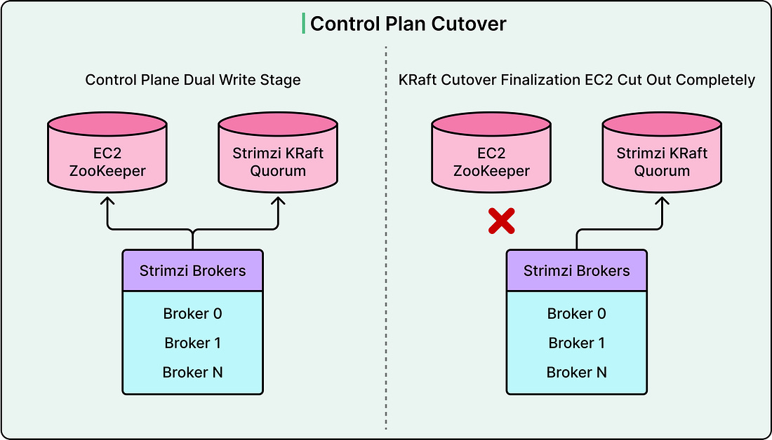 Phase 5: Migrating the Control PlaneZooKeeper had managed Kafka’s metadata throughout the entire broker migration. Reddit made a deliberate choice not to change the control plane until after the data plane was fully stable on Kubernetes. This separation of concerns reduced the risk of compounding failures. Once all EC2 brokers were terminated and all data and traffic were running on Kubernetes, Reddit executed the migration from ZooKeeper to KRaft. KRaft is Kafka’s built-in metadata management system that eliminates the need for ZooKeeper. See the diagram below: Since Strimzi and Kafka both provide documented steps for this migration, and because the rest of the system had already settled, this final phase was comparatively straightforward. Phase 6: Cleaning Up and Handing Off to Standard StrimziAfter both the data plane and the control plane were fully running on Kubernetes, Reddit removed all the configuration overrides that the forked Strimzi operator had introduced. Control of the clusters was handed off to the standard, unmodified Strimzi operator. The EC2 infrastructure was decommissioned. ConclusionReddit’s migration is a good example of how large-scale infrastructure changes do not have to be dramatic, high-risk events. By breaking the work into small, reversible, well-understood steps and by respecting the constraints the system imposed, Reddit moved a petabyte-scale platform to Kubernetes without a single moment of downtime. Some key lessons from Reddit’s migration journey were as follows: