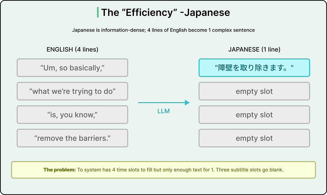 If you’ve ever built anything that sends LLM output into a system expecting predictable structure (JSON schemas, form fields, database rows), you’ve probably hit a version of this same tension. The model optimizes for quality, and quality doesn’t always respect the structural contract your system depends on. The Geometry of LanguageThis problem gets significantly worse when you move beyond European languages. Different languages don’t just use different words. They organize thoughts in fundamentally different orders and densities. Vimeo’s engineering team started calling this “the geometry of language,” and it essentially signifies that the shape of a sentence changes across languages in ways that make one-to-one line mapping structurally impossible in some cases. For example, Japanese is far more information-dense than English. Where an English speaker might speak four lines of filler (”Um, so basically,” / “what we’re trying to do” / “is, you know,” / “remove the barriers”), a typical Japanese translation consolidates all of that into a single, grammatically tight sentence. See the example below: