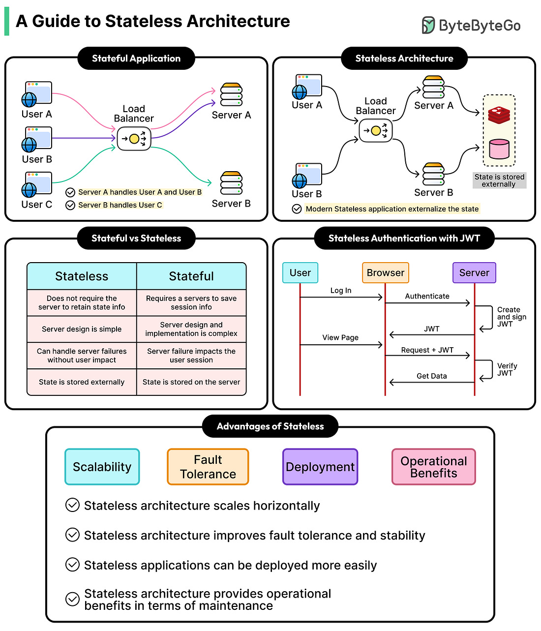 Latest articlesIf you’re not a subscriber, here’s what you missed this month. To receive all the full articles and support ByteByteGo, consider subscribing: When we hear “stateless architecture”, we often think it means building applications that have no state. That’s the wrong picture, and it can lead to confusion about everything that follows. Every application has a state, such as user sessions, shopping carts, authentication tokens, and preferences. All of that is state. It’s the application’s memory and the very thing that makes personalized digital experiences possible. Without it, every visit to a website would feel like the first time. In other words, stateless architecture doesn’t eliminate state but relocates it. Understanding where the state moves, why we move it, and what that move costs us is essential for developers. In this article, we will understand the nuances of stateless architecture in more detail. The Problem with Keeping State on the Server...Continue reading this post for free in the Substack app |